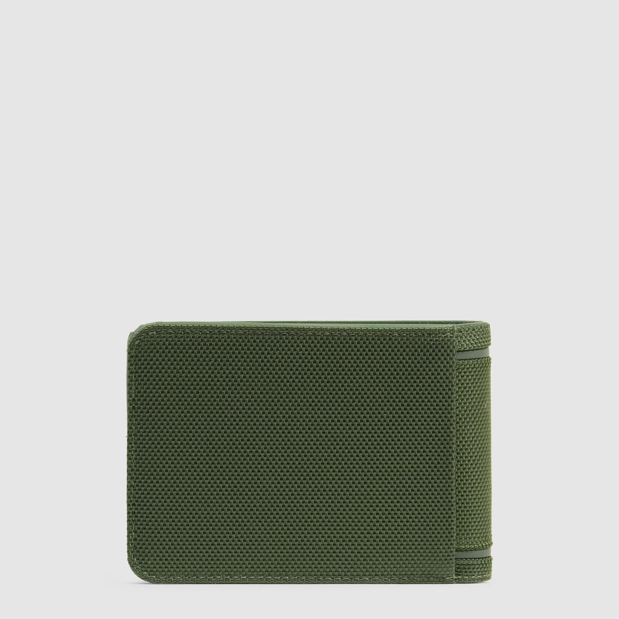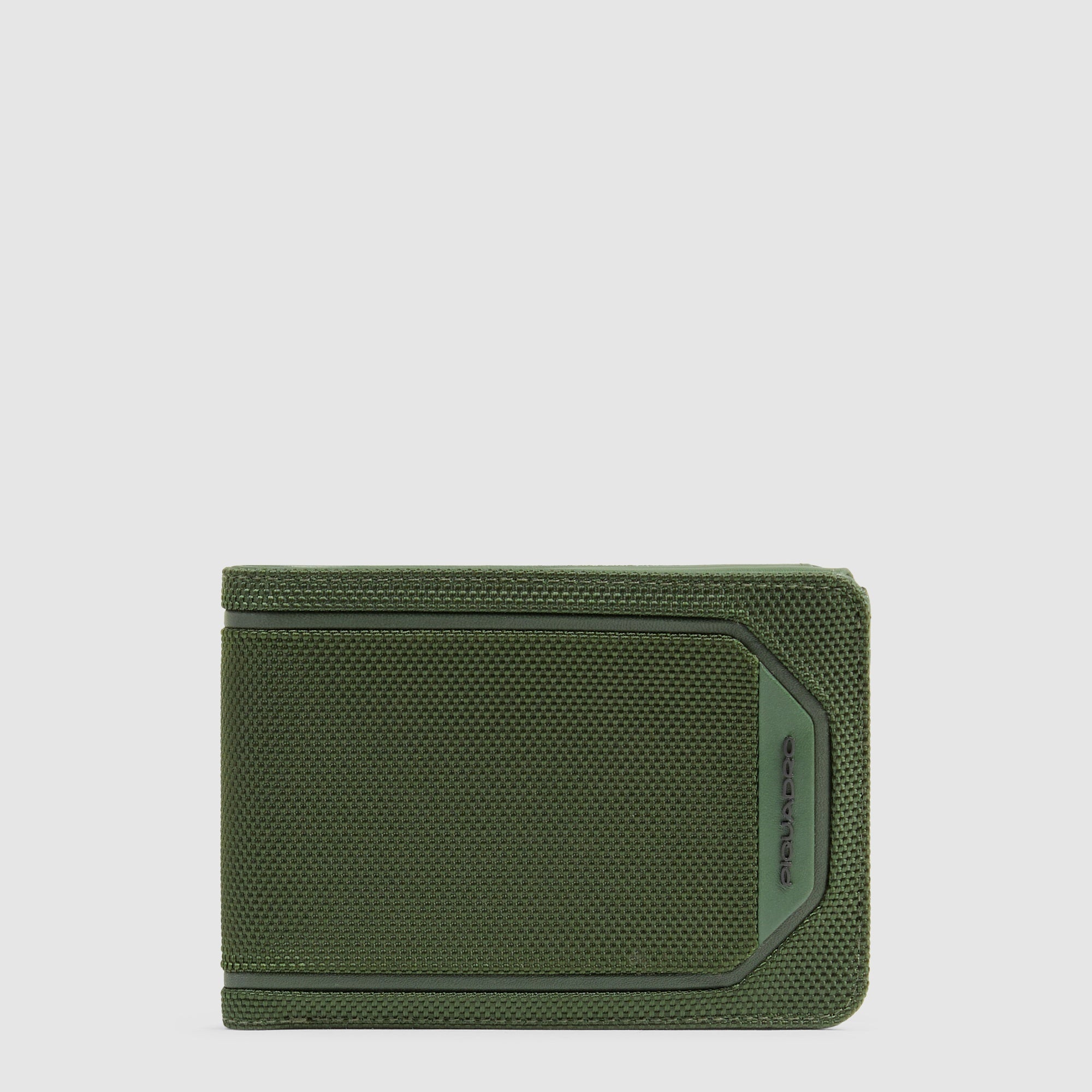 Men’s wallet in recycled textile and leather with flip up ID window, coin pocket, credit card slots and RFID protection