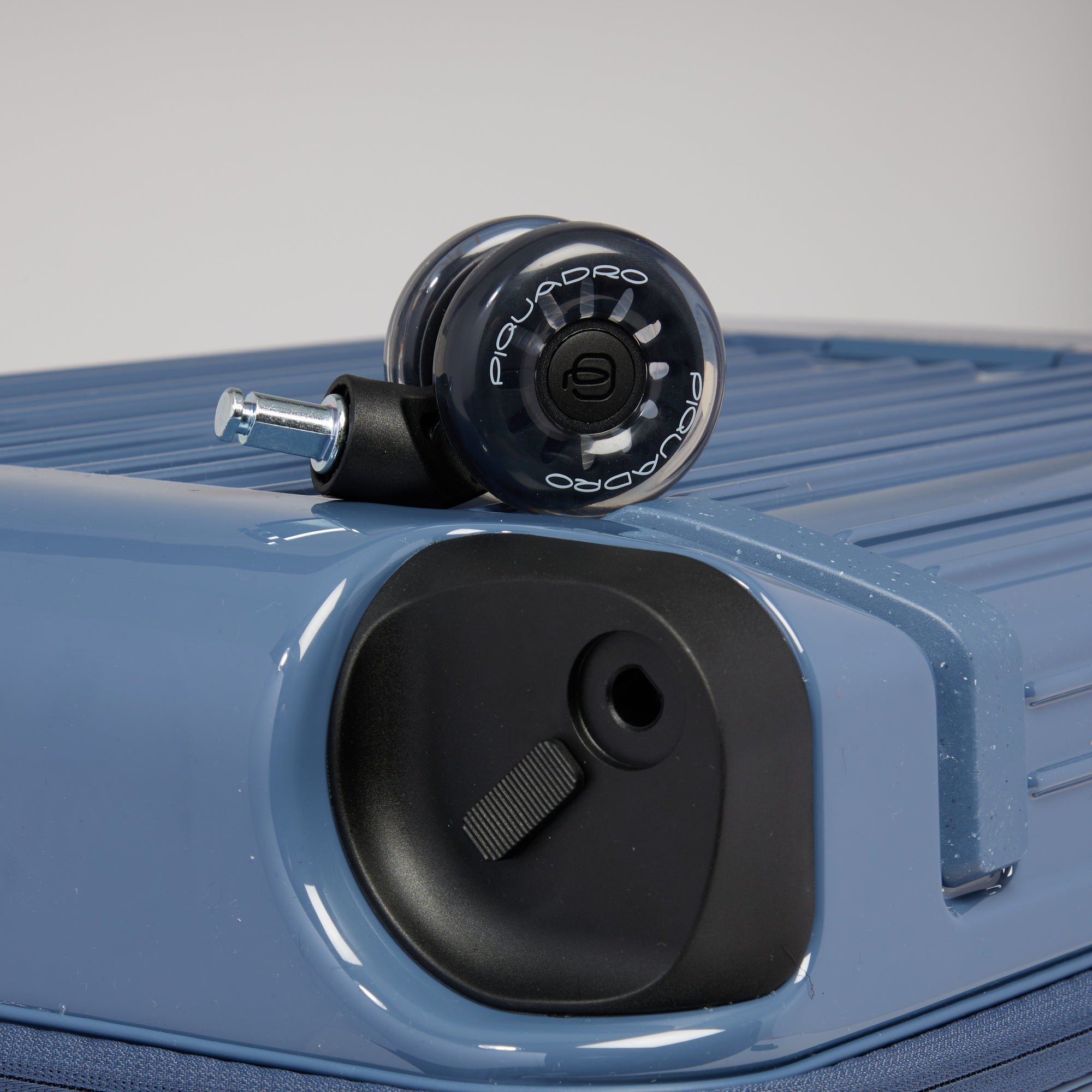 Piquadro's POP luggage collection is a riot of color and innovation. Available in white, blue, green, yellow and gray, they feature sliding and interchangeable wheels, which can also be purchased separately to add a touch of personality to your luggage. The suitcases also have corners that protect them from impacts. To make each item even more unique, POP suitcases can be personalized with your own initials (max 3 characters) by choosing the metal tag in your favorite color.